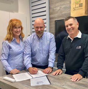Toby and Rosie pictured right with Chris Rocker, sign the contract for Just Shutters.